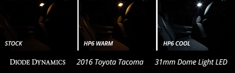 Features  Direct replacement for factory 31mm festoon bulb Increased output with LED appearance Plug and play  simple installation  Overview Design. The 31mm HP6 LED bulb is a direct replacement for any 31mm-size bulb  commonly found in door lights  dome lights  and trunk lights in many vehicles. Populated with eight high-power LEDs arranged in an omnidirectional pattern  the HP6 upgrades the factory yellowish incandescent bulb to a more modern LED appearance  while providing far more light output than the factory bulb. Thanks to the frosted cover  the HP6 provides even light distribution and a clean  factory-style appearance. With its durable metal terminals  it will fit snugly in the socket  and its light weight means it won't vibrate loose over time.  Reliability. Unlike other bulbs on the market  this bulb is built with constant-current circuitry  along with transient suppression. That means this bulb will last for years  not months  with no flickering or failure. And like every Diode Dynamics product  it's backed by an industry-leading three-year replacement warranty. Brightness. With 140 lumens of true  measured output  the HP6 LED will provide far more light output than your original 31mm-sized bulb. All Diode Dynamics LED lighting is rated with accurate  measured lumen figures  not calculations or guesses. We test the true output in-house  and provide you the real numbers to compare. Colors. In addition to vibrant colors of blue and red  the HP6 is available in a cool white 6000K option as well. Whether you want a modern cool white appearance  or a color to show off your unique style  we have the color to fit your need!